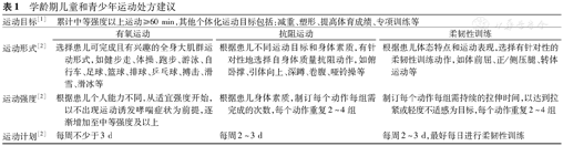 | 运动目标[55] | 累计中等强度以上运动≥60 min,其他个体化运动目标包括:减重、塑形、提高体育成绩、专项训练等 | ||