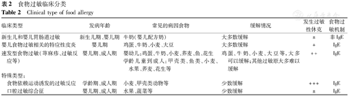 | 临床类型 | 发病年龄 | 常见的病因食物 | 缓解情况 | 发生过敏性休克 | 食物过敏机制 | |