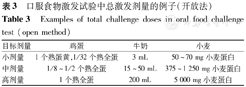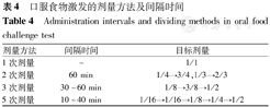 实施方法大致分为2种,一种是单次食物激发,即单次给予目标剂量的激发食物,此类激发试验适用于判断食物耐受情况;另一种是少量分次给予激发食物,每隔20~60 min给1次,此类方法适用于明确食入过敏食物的安全剂量。目标剂量一般分为小、中、大剂量,婴儿酌减。小剂量一般为意外暴露于过敏原情况下的剂量,适用于初始进行食物激发且极有可能诱发过敏症状的患者,若无明显症状,则再予中到大剂量激发食物,具体剂量见表3,具体方法见表4。速发型过敏反应常在1~2 h内发生,试验过程中如果未发生过敏反应,在试验结束后仍需留观患者2 h,并告知患者24 h内仍有出现症状的可能性,对怀疑非速发型过敏反应的患者,应延长观察时间(如留院1 d)。