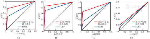 注:FOBT为粪便隐血试验;ROC为受试者工作特征;以病理诊断为金标准;各病变均以健康体检者为对比;基因甲基化联合检测时甲基化位点数≥5个为阳性