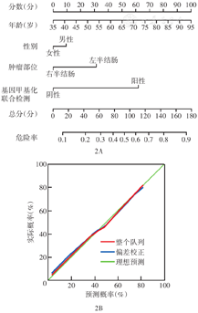 粪便SDC2、PPP2R5C和ADHFE1基因甲基化联合检测阳性率在年龄、性别、分化程度、TNM分期和肿瘤部位分层患者间差异均无统计学意义(均P>0.05);FOBT检测时,肿瘤位于左半结肠者阳性率高于右半结肠者(P<0.05),FOBT检测阳性率与其他因素均不相关(均P>0.05)(表3)。年龄不是基因甲基化联合检测和FOBT检测准确性的因素,提示二者对年轻人和老年人有同等的检测价值;基因甲基化联合检测和FOBT检测在筛查51~60岁的结直肠癌患者时均显示出较其他年龄段有良好的价值。在>50岁结直肠癌患者的筛查中,基因甲基化联合检测阳性率高于FOBT[90.2%(55/61)比68.9%(42/61),P<0.05]。依据基因甲基化联合检测和各临床特征构建的预测结直肠癌的列线图(图2A),列线图的校准曲线显示,预测和观察到的诊断结直肠癌效能之间具有高度一致性(图2B),表明构建的预测结直肠癌模型具有较高的辨别和校准能力。