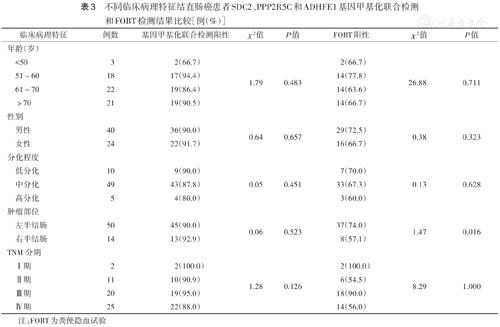 不同临床病理特征结直肠癌患者SDC2、PPP2R5C和ADHFE1基因甲基化联合检测和FOBT检测结果比较[例(%)]