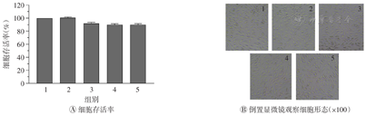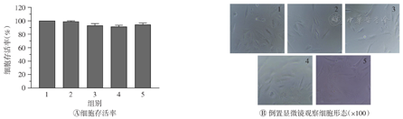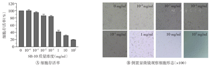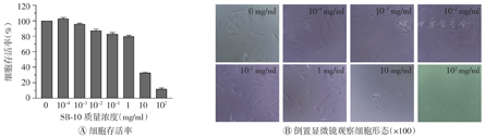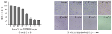 分别取对数生长期的L-929细胞和MC3T3-E1细胞,消化制成单细胞悬液后计数,调整细胞浓度为1.0×105个/ml,按每孔100 μl接种于96孔板中,于37 ℃、5%CO2培养箱中培养24 h;吸弃培养液,PBS洗涤2次,分别加入不同质量浓度的脱细胞试剂液,阴性对照组加入不含脱细胞试剂的新鲜培养基,继续培养24 h;吸弃培养液,每孔加入50 μl质量浓度为1 g/L的噻唑蓝溶液共培养4 h;吸弃噻唑蓝溶液,每孔加入100 μl异丙醇,采用酶标仪检测各孔于570 nm处的吸光度值,计算细胞存活率。