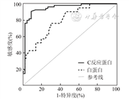 3.各指标预测肠坏死的价值:分别将两组有统计学意义的指标绘制成ROC曲线预测中肠扭转患儿肠坏死的可能性,结果显示C反应蛋白>9.88 mg/L和血清白蛋白<36.65 g/L可较好地提示中肠扭转患儿可能出现肠坏死,AUC分别为0.883(95%CI 0.780~0.985)和0.792(95%CI 0.690~0.894),敏感度76.2%、70.1%,特异度94.3%、94.3%。见图1。