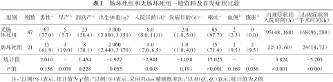 肠坏死组和无肠坏死组一般资料及首发症状比较