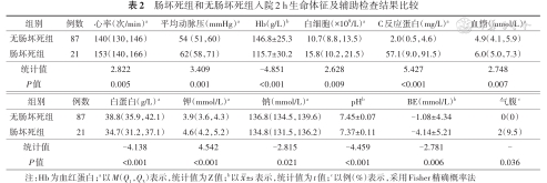 | 无肠坏死组 | 87 | 38.8(35.9,42.1) | 3.9(3.6,4.3) | 136.8(134.5,139.6) | 7.45±0.07 | -1.08±4.34 | 0(0) |