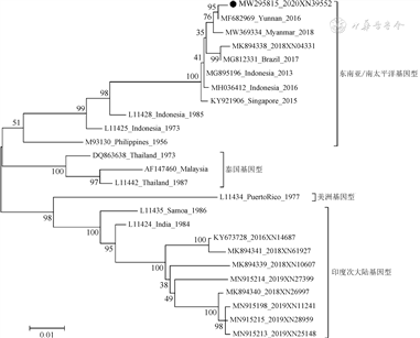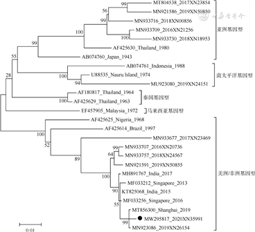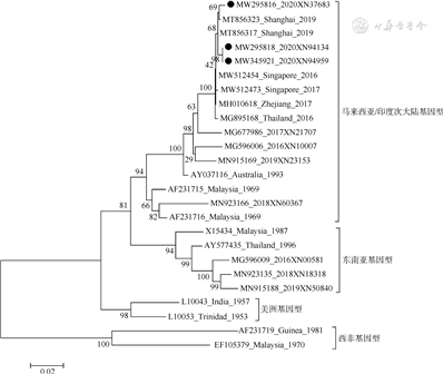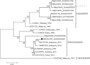 4. 登革病毒E基因序列测定及进化分析:荧光定量PCR检测结果为阳性的疑似病例标本全部测得登革病毒E基因序列,序列上传至GenBank。将2020年测得的序列与GenBank中的参考序列和广州市2016-2019年序列比对并构建基因进化树,广州市序列以GenBank序列编号、年份和实验室编号表示,其他序列以GenBank序列编号、国家(地区)和年份表示。