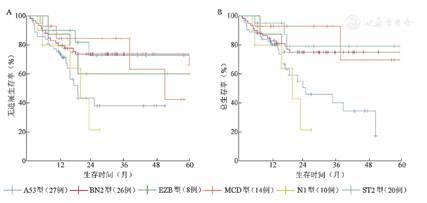 N1型(NOTCH1突变),MCD型(MYD88L265P、CD79B突变),BN2型(NOTCH2突变或BCL6易位),EZB型(EZH2突变或BCL2融合),A53型(非整倍体的TP53失活)和ST2型(SGK1、TET2突变),其余为Others[4]。