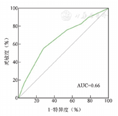 绘制不同LymphGen基因分型预测OS的ROC曲线(图3),AUC=0.66,提示LymphGen基因分型评估本组105例DLBCL患者生存风险具有一定的区分度,LymphGen基因分型在本组DLBCL患者预后评估中具有一定价值。