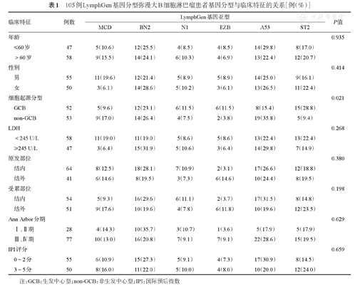 105例LymphGen基因分型弥漫大B细胞淋巴瘤患者基因分型与临床特征的关系[例(%)]