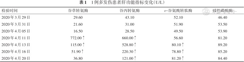 患者,男,32岁,因“车祸伤12 h”于外院治疗效果不佳,2020年3月28日转入滨州医学院附属医院急诊重症监护病区。入院诊断:创伤性休克(尿道损伤、膀胱积血),I型呼吸衰竭,双侧创伤性湿肺,胸腔积液,脑挫裂伤,右肾周积液,低蛋白血症。患者既往身体健康,无食物及药物过敏史。入院查体:嗜睡状态,舌后坠明显,尿道口损伤出血。头颅无畸形;眼睑无水肿,巩膜无黄染,角膜透明,双侧瞳孔等大等圆,直径约2 mm,对光反应灵敏;耳廓正常,外耳道无分泌物流出,听力粗测正常;鼻无畸形,无分泌物流出;胸廓正常对称,胸骨压痛不明显,呼吸运动可,叩诊清音,听诊双肺散在湿啰音,未闻及胸膜摩擦音。心前区无隆起,心尖搏动正常,心界正常,心音低钝,心率76次/min,心律齐,各瓣膜区未闻及杂音。腹部平坦,腹软,压痛及反跳痛检查不配合,肝脾肋下未触及,移动性浊音(-),肠鸣音3次/min;四肢及脊柱无畸形,各关节活动自如,肌张力正常,肌力V级,Hoffmann征(-),Babinski征(-)。入院急查颅脑、颈椎、胸部、全腹部、骨盆CT示:颅脑未见明显异常;颈椎未见明显骨折及脱位;双侧创伤性湿肺,双侧少量胸腔积液;双侧肋骨及胸骨呈双边改变;右肾少许积液;骨盆未见明显骨折及脱位。泌尿系彩超示:膀胱内混合型回声-积血可能。血常规:白细胞10.2×109/L,中性粒细胞百分比89.2%,红细胞2.3×1012/L,血红蛋白70 g/L。肝功能未见明显异常。动脉血气分析:pH 7.37,二氧化碳分压28 mmHg(1 mmHg=0.133 kPa),氧分压56 mmHg,钠141 mmol/L,钾2.4 mmol/L,血糖27.8 mmol/L,乳酸1.7 mmol/L,氧饱和度88%。给予液体复苏,补钾,抗感染,止血,纠正贫血,纠正低蛋白血症。2020年3月30日患者出现发热,最高体温37.8 ℃,复查胸部CT示:肺部炎症较前加重。将抗生素调整为注射用哌拉西林钠他唑巴坦钠(商品名为特治星,Wyeth Lederle S.R.L.,批号ALTG/11,规格4.5 g),4.5 g,ivgtt,q8h(注射用哌拉西林钠他唑巴坦钠皮试阴性)。患者体温恢复至正常,意识渐转清晰,营养支持由静脉营养逐渐调整为自主饮食,余治疗措施不变。2020年4月5日患者再次出现发热伴畏寒及咽部不适,最高体温38.4 ℃,考虑上呼吸道感染可能,给予复方锌布颗粒退热对症处理,患者体温降至正常。2020年4月11日患者体温升至41.0 ℃,伴畏寒、寒战,给予紧急退热处理并急查血常规+血沉:白细胞5.6×109/L,中性粒细胞百分比81.8%,血沉47 mm/h,降钙素原0.46 μg/L,C反应蛋白94.90 mg/L。胸部CT示:双肺病变较前好转。肝功能示:谷丙转氨酶772.00 U/L,谷草转氨酶660.00 U/L,碱性磷酸酶81.20 U/L,r谷氨酰转肽酶56.60 U/L。患者急性肝损伤,分析发热及急性肝损伤原因,考虑患者病情较前好转,不能排除注射用哌拉西林钠他唑巴坦钠药品不良反应,遂立即停用该药,并给予多烯磷脂酰胆碱注射液护肝,复方锌布颗粒退热处理。患者停用注射用哌拉西林钠他唑巴坦钠后第2天即未再出现发热,肝功能情况如表1所示。病情稳定且肝功能好转后,准予出院继续口服护肝药物治疗。