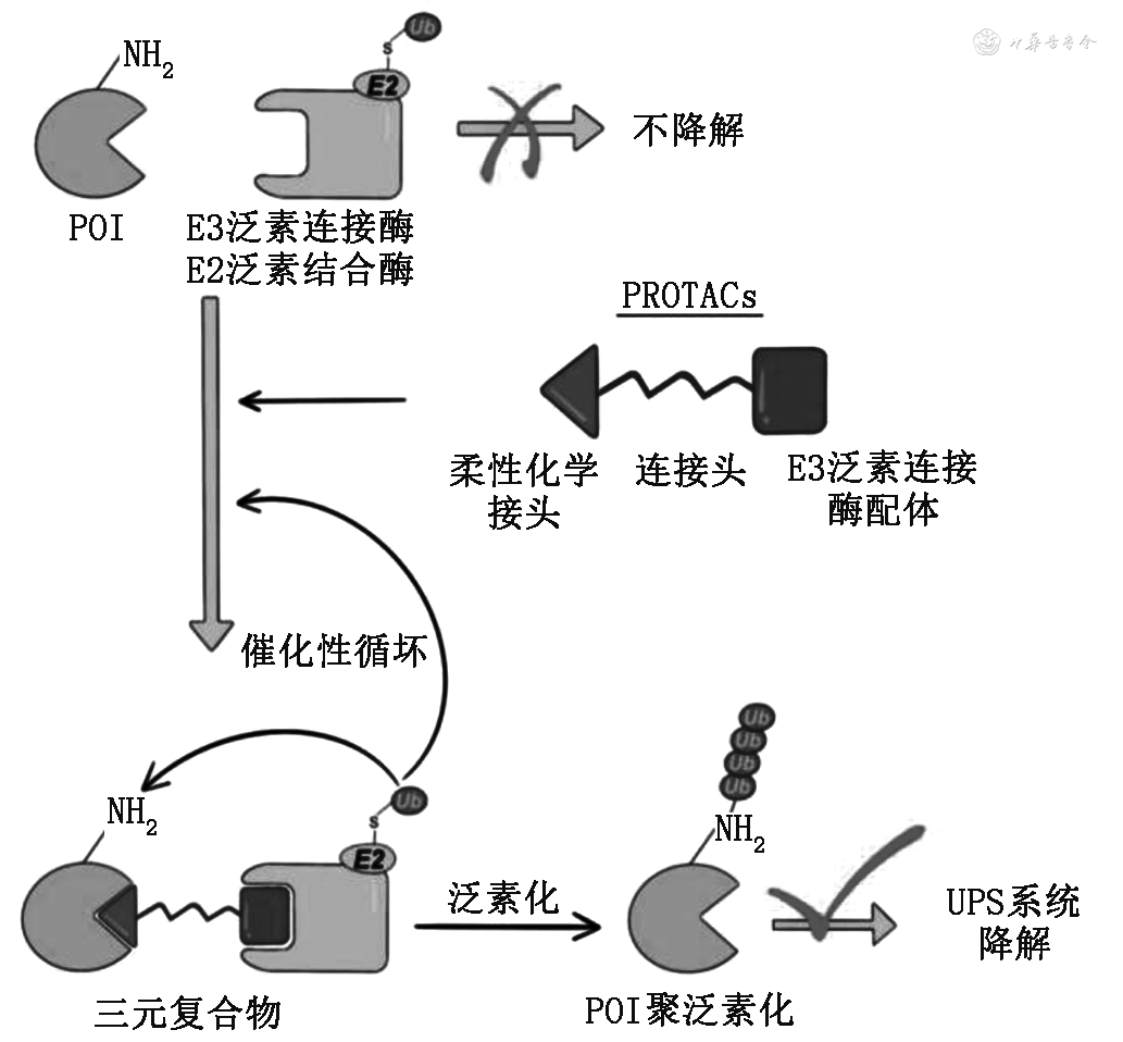在癌症治疗方面,降解蛋白质比抑制蛋白质合成具有更大疗效[7]。靶向蛋白质降解(targeted protein degradation,TPD),即消除靶蛋白(protein of interest,POI)的过程,在癌症治疗领域具有可观的发展前景[8]。PROTACs的概念最早在2001年由Crews和Deshaies提出,并成功利用该技术对甲硫氨酰氨肽酶2(MetAp-2)进行降解[9]。PROTACs是一种具有异源双功能的小分子降解剂,由3个元素构成:两端分别为POI结合配体和E3泛素连接酶(ubiquitin-ligase enzymes E3)配体,中间为连接头(linker)。当PROTACs进入细胞后,通过柔性化学接头识别并结合POI,特异性募集E3泛素连接酶,形成稳定的“POI-PROTACs-E3泛素化连接酶”三元复合物。E2泛素结合酶(ubiquitin-conjugating enzyme E2-UCE)与E3泛素连接酶共同作用将POI聚泛素化标记后,通过细胞内现存的泛素-蛋白酶体系统(ubiquitin-proteasome system,UPS)特异并高效地使POI降解,从而治疗疾病[10](图1)。