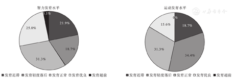 32例患儿出院后在我院高危儿门诊随访,2岁时采集贝利婴幼儿发育量表评估,结果显示MDI 92.75±24.11,PDI 88.16±21.42,MDI与PDI间差异无统计学意义(P>0.05)。分别有13例(40.6%)和17例(53.1%)的患儿智力、运动处于发育轻度落后至发育迟滞水平,见图1。