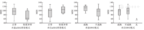 因围术期aEEG显示有惊厥活动的病例数少,未能纳入统计分析,仅将术前和术后的背景模式、SWC与MDI、PDI进行关联性分析。术前背景模式轻度异常的患儿MDI显著低于术前背景模式正常的患儿(t=2.162,P=0.039);术后SWC缺乏的患儿仅有2例,未能纳入统计分析,该2例患儿2岁的贝利婴幼儿发育量表测试结果分别为MDI 50、PDI 50和MDI 50、PDI 70,均明显降低。SWC成熟与SWC不成熟的MDI差异无统计学意义(P>0.05),见图2。