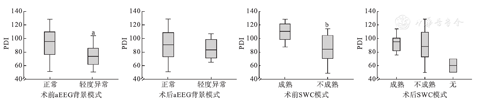 术前背景模式轻度异常的患儿PDI显著低于术前背景模式正常的患儿(t=2.082,P=0.046);术前SWC不成熟的患儿PDI显著低于术前SWC正常的患儿(t=2.331,P=0.027),见图3。
