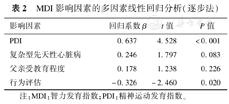 单因素分析结果显示,复杂型CHD(P=0.079)、父亲受教育程度(P=0.071)、行为问题(P=0.013)、PDI(P<0.001)是MDI可能的影响因素。进一步纳入多因素线性回归模型结果显示,PDI和存在行为问题是MDI的影响因素。PDI越高,MDI越高(β=0.637);存在轻度行为异常,MDI较低(β=-0.326),见表2。