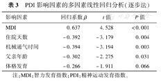 单因素分析结果显示,住院天数(P=0.022)、机械通气时间(P=0.012)、体格发育状况(P=0.021)、MDI(P<0.001)、父亲年龄(P=0.036)是PDI可能的影响因素。进一步纳入多因素线性回归模型结果显示,MDI、住院天数、机械通气时间和父亲年龄是PDI的影响因素。MDI越高,PDI越高(β=0.637);住院天数越长,PDI越低(β=-0.392);机械通气时间越长,PDI较低(β=-0.394);父亲年龄越大,PDI越低(β=-0.302),见表3。