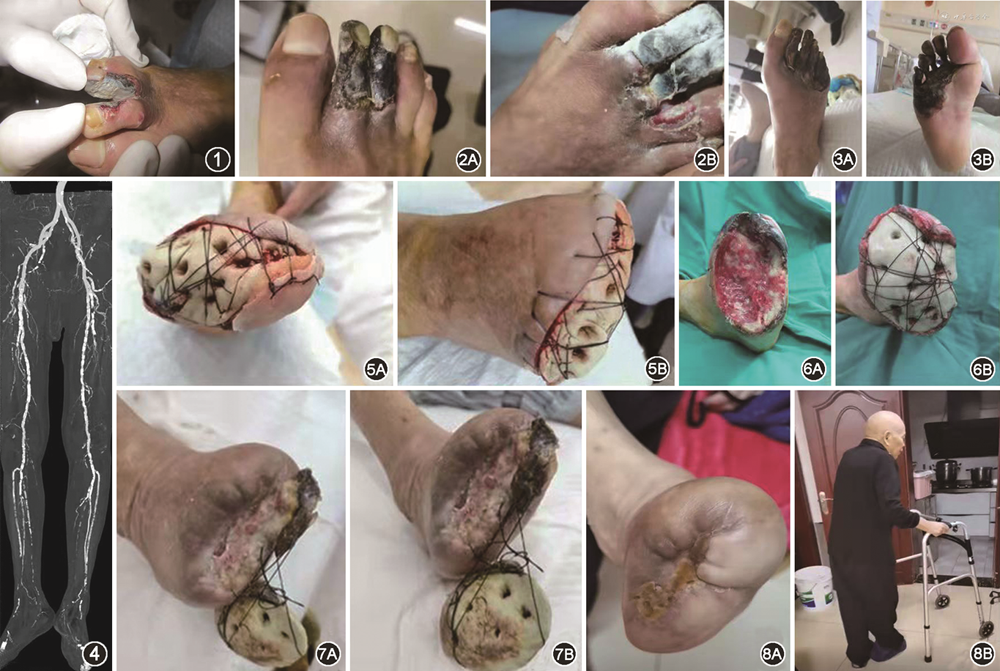例1 男,84岁。2020年6月22日主因“发现血糖升高15年,间歇性跛行6年,右足破溃50 d”第1次入我院,初步诊断为:2型糖尿病,糖尿病足Wagner 4级(TEXAS 4级D期),糖尿病周围神经病,糖尿病下肢血管病,下肢动脉闭塞症介入术后,高血压病3级(极高危),冠心病。患者15年前发现血糖升高,查空腹血糖为13.5 mmol/L,诊断为2型糖尿病,给予皮下注射“诺和灵30 R”治疗,监测空腹血糖为5~7 mmol/L。6年前开始出现双下肢间歇性跛行,伴双足麻木、发凉、刺痛,未诊治,上述症状逐渐加重。50 d前无明显诱因出现右足第3趾远端趾间关节内侧水疱,挠破后感染、溃烂,遂至当地医院就诊,行下肢动脉CT血管成像示双下肢动脉闭塞,行“右下肢膝下球囊扩张术”。术后进行第3趾溃疡处清创及负压吸引治疗,创面溃烂加重,右足第2趾外侧及第3趾内侧发黑坏死,足部疼痛、发凉均未明显改善,遂至我科治疗。既往高血压病史20余年,冠心病史10年,否认吸烟史,有饮酒史50年,已戒酒3年。有高血压及糖尿病家族史。