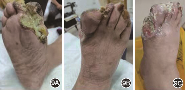 体格检查:体温36.4 ℃,脉搏87 次/min,呼吸22 次/min,血压125/80 mmHg,双下肢无水肿,双侧股动脉、腘动脉搏动减弱,左侧胫后动脉、足背动脉搏动减弱,右侧胫后动脉、足背动脉未触及。右足NRS评分5分。右足第1、2趾红肿、溃烂,深达跖骨。前足足底内侧皮肤溃破,大小为7 cm×8 cm,可见肌腱及骨质暴露,覆盖较多黄色感染失活组织及脓性分泌物(图9)。