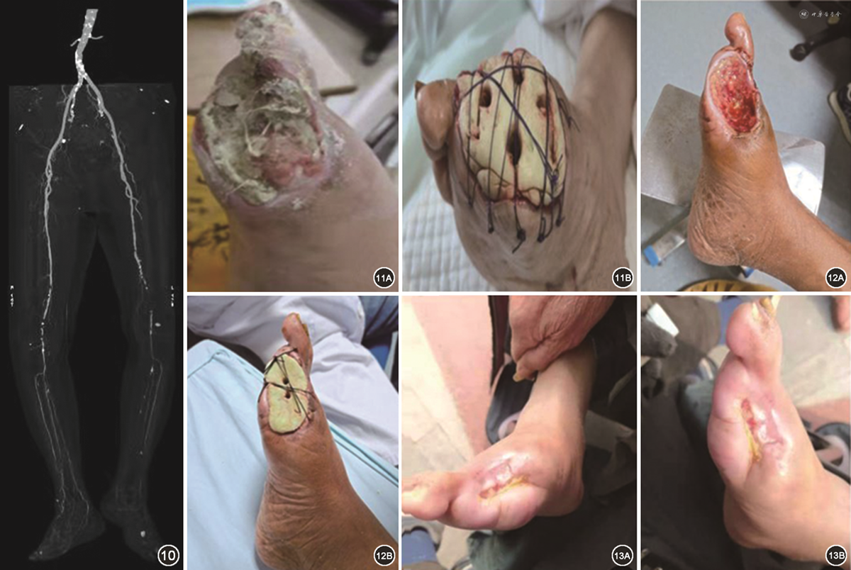 入院后检查,白细胞7.62×109/L,中性粒细胞5.05×109/L,淋巴细胞0.95×109/L,血红蛋白93 g/L,CRP为18.16 mg/L。红细胞沉降率为55 mm/1 h。肝功能:白蛋白29.9 g/L。肾功能:肾小球滤过率53.43 ml/min。空腹血糖8.6 mmol/L。ABI左侧1.48,右侧0.45。下肢动脉超声:双侧股总动脉内中膜增厚;双侧股总动脉、股浅动脉、股深动脉、腘动脉、胫后动脉、胫前动脉、足背动脉多发斑块形成;双侧下肢动脉多发局部管腔狭窄;左侧胫后动脉局部管腔闭塞可能。双下肢CT血管成像:双侧股动脉、腘动脉多发软硬斑,管腔局部中至重度狭窄,双下肢动脉硬化闭塞表现;腹主动脉、双侧髂总动脉及髂内动脉软硬斑,局部管腔轻度狭窄;双侧小腿及双足皮下水肿,右足局部结构缺损(图10)。