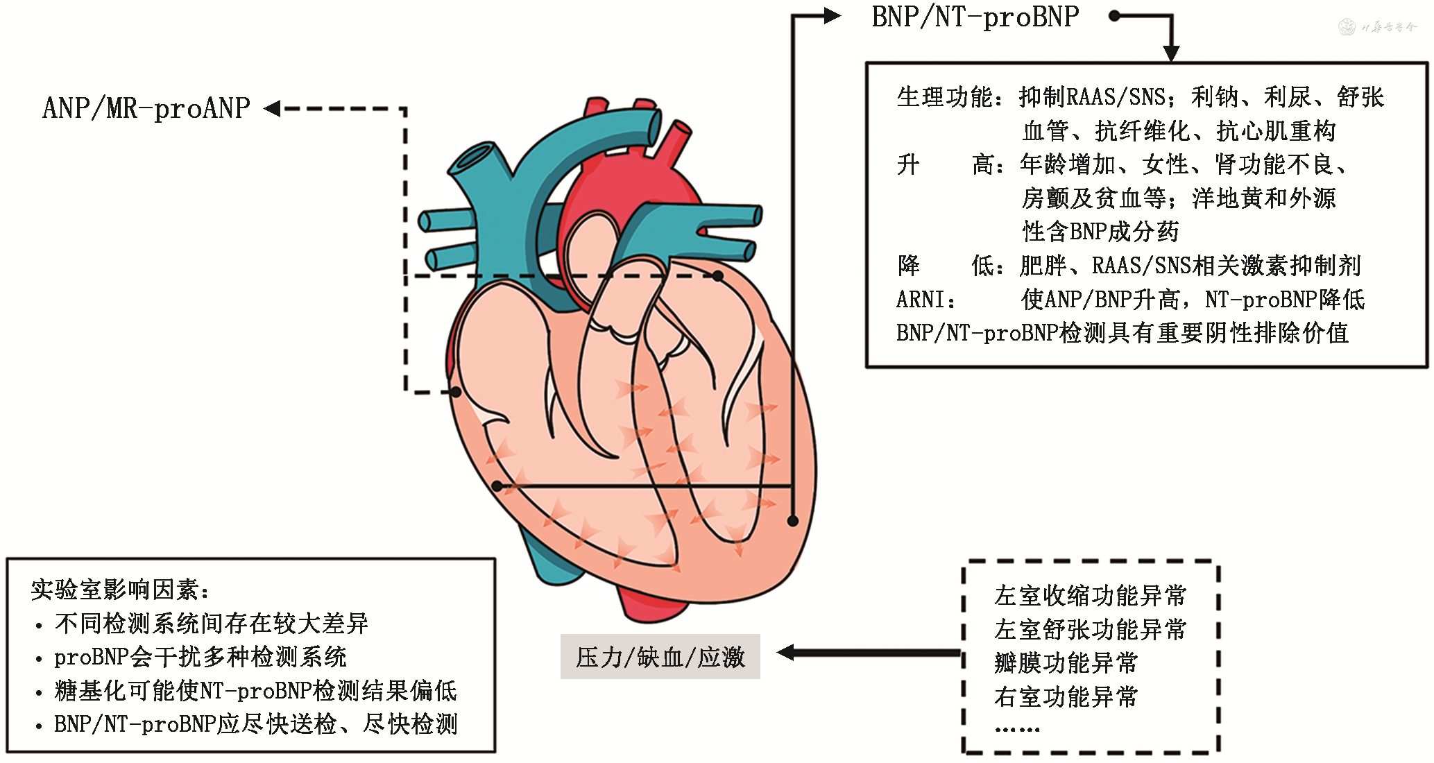 注:ANP为A型利钠肽;MR-proANP为心房利钠肽前体中间片段;BNP为B型利钠肽;NT-proBNP为N末端B型利钠肽前体;RAAS为肾素-血管紧张素-醛固酮系统;SNS为交感神经系统;ARNI为血管紧张素脑啡肽酶抑制剂;感谢蔺墨霏同学提供手绘插图实验室检测