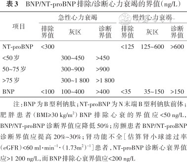 注:BNP为B型利钠肽;NT-proBNP为N末端B型利钠肽前体;肥胖患者(BMI≥30 kg/m2)BNP排除心衰的界值应<50 ng/L,BNP/NT-proBNP诊断界值应降低50%;房颤患者BNP/NT-proBNP诊断界值应提高20%~30%;肾功能不全[估算肾小球滤过率(eGFR)<60 ml·min-1·(1.73m2)-1]患者,NT-proBNP诊断心衰界值应>1 200 ng/L,而BNP排除心衰界值应<200 ng/L