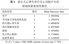 建立随机森林模型,对心律失常合并心功能不全的影响因素做重要性排序。结果显示,早产及孕母患自身免疫性疾病对于新生儿心功能的影响最大,其次为胎儿期心律失常、围生期窒息缺氧、感染因素(表2)。