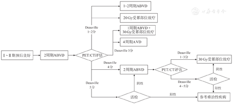 Ⅰ~ⅡA期预后良好患者的治疗:标准治疗为2~4个周期ABVD方案(阿霉素+博来霉素+长春花碱+达卡巴嗪)化疗联合放疗。对于一部分不伴危险因素、预后良好的患者可行ABVD×2个周期+放射治疗(RT)(20 Gy)[8];也可以根据ABVD×2个周期后PET/CT评估结果调整用药方案(图1)[9],但即使早期PET/CT阴性,综合治疗的无进展生存(PFS)率也较单纯化疗更高。