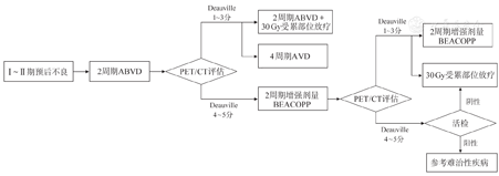 Ⅰ~ⅡB期预后不良患者的治疗:标准治疗为2个周期ABVD方案后行PET/CT评估,评分1~3分患者考虑2个周期ABVD方案化疗联合30 Gy放疗或4个周期AVD方案;评分4~5分的患者推荐2个周期增强剂量BEACOPP方案后再行PET/CT评估[10],根据PET/CT评估结果调整用药方案[9](图2)。