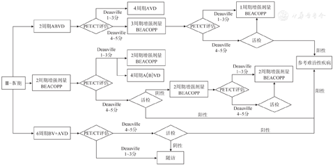 ABVD:阿霉素+博来霉素+长春花碱+达卡巴嗪;AVD:阿霉素+长春花碱+达卡巴嗪;BEACOPP:博来霉素+依托泊苷+阿霉素+环磷酰胺+长春新碱+丙卡巴嗪+泼尼松;BV:维布妥昔单抗