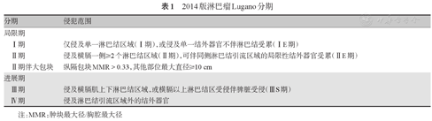 淋巴瘤的临床分期依据疾病侵犯部位及有无B症状,目前采用的是2014版Lugano分期标准[6](表1)。根据患者有无B症状[①不明原因发热>38 ℃,连续3 d以上,排除感染;②夜间盗汗(可浸透衣物);③体重于诊断前半年内下降>10%]分为A组(无B症状)和B组(有B症状)。