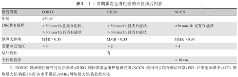 注:EORTC:欧洲癌症研究与治疗组织;GHSG:德国霍奇金淋巴瘤研究组;NCCN:美国国立综合癌症网络;ESR:红细胞沉降率;MTR:肿块最大径/胸腔T5或T6水平横径;MMR:肿块最大径/胸腔最大径