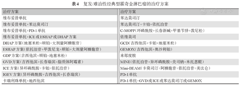 复发或难治性cHL的治疗原则首选二线挽救方案化疗后进行大剂量化疗联合ASCT,二线化疗尽可能达到完全缓解(CR)。维布妥昔单抗联合化疗方案如ICE方案(CR率88%)[17]、ESHAP方案(CR率70%)[18]、DHAP方案(CR率81%)[19]使更高比例患者获得了CR,增加了ASCT的成功率。维布妥昔单抗联合苯达莫司汀(CR率73.6%)[20]及维布妥昔单抗联合PD-1单抗(CR率61%)[21]是NCCN(2022年版)指南的推荐联合用药方案[22,23]。PD-1单抗联合GVD方案(CR率85.2%)[24],PD-1单抗联合ICE方案(CR率86.5%)[24,25],PD-1单抗联合Gemox方案(CR率90%)[26],在复发/难治性(r/r)HL中获得较好疗效。对于不符合ASCT条件的患者,可选择化疗、维布妥昔单抗±化疗、PD-1单抗±化疗和(或)放疗。挽救治疗方案见图4及表4。