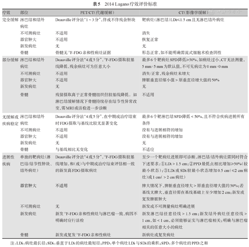 | 完全缓解 | 淋巴结和结外病灶 | Deauville评分法"1~3分",伴或不伴残余肿块 | 靶病灶(淋巴结)LDi≤1.5 cm且无淋巴结外病灶 |