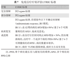 | 无缓解或疾病稳定 | 淋巴结和结外病灶 | Deauville评分法"4或5分",在中期或治疗结束时FDG摄取与基线比较无显著变化 | 最多6个靶淋巴结SPD降低<50%,且不符合疾病进展所有条件 |
