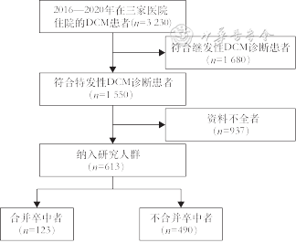 本研究纳入了2016年1月至2020年12月首都医科大学附属北京安贞医院、北京市房山区良乡医院和首都医科大学附属复兴医院住院的特发性DCM患者。纳入标准:(1)符合DCM诊断:左心室射血分数(left ventricular ejection fraction,LVEF)≤45%或左心室缩短速率(left ventricular fractional shortening,LVFS)<25%,左心室舒张期末内径(left ventricular end-diastolic dimension,LVEDD)>5.0 cm(女性)和LVEDD>5.5 cm(男性)[7]。(2)纽约心脏协会(NYHA)心功能分级Ⅱ级及以上。排除标准:缺血性心肌病、致心律失常性心肌病、风湿性心脏病、先天性心脏病、肺源性心脏病、药物性心肌病、围产期心肌病、高血压性心脏病、瓣膜性心脏病、酒精性心肌病以及资料不全者。