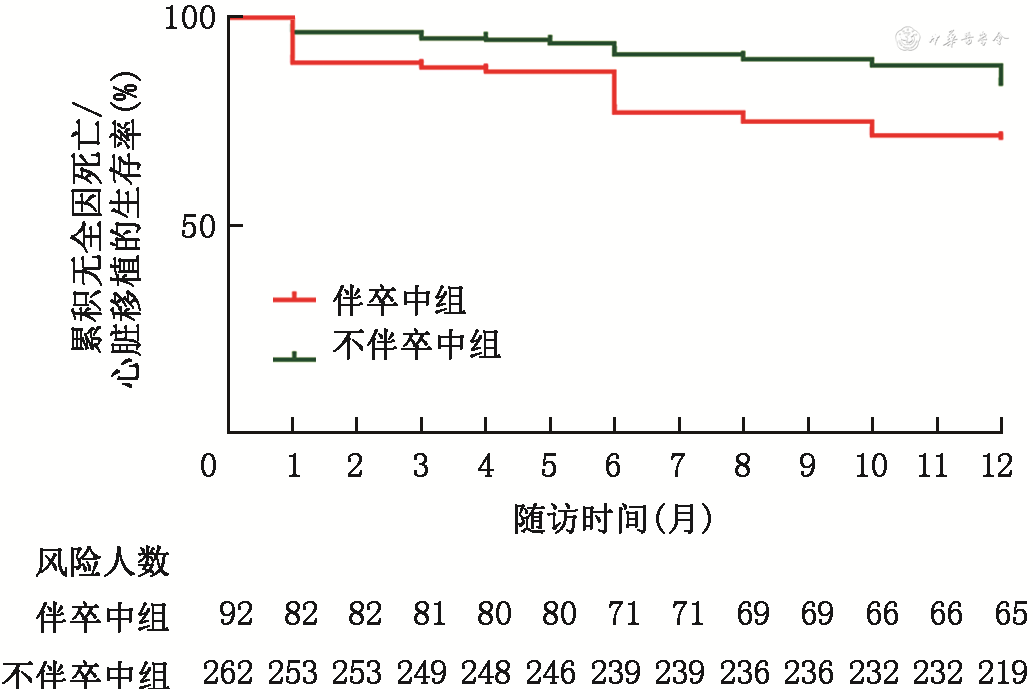 4. 随访结局:354例特发性DCM患者,包括合并IS者92例、不合并IS者262例,接受了至少1年的随访。在随访期间,49例患者死亡(合并IS者26例、不合并IS者23例),21例患者接受了心脏移植(合并IS者1例、不合并IS者20例),合并IS患者和不合并IS患者的1年累积生存率(即未发生全因死亡或心脏移植)分别为70.7%、83.6%,差异有统计学意义(χ2=8.28,P=0.004)(图2)。死因为恶性心律失常(合并IS者3例、不合并IS者5例)、顽固性心衰(合并IS者22例、不合并IS者18例)、脑疝(合并IS者1例)。