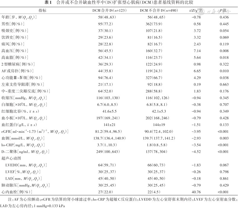 | 指标 | DCM合并IS(n=123) | DCM不合并IS(n=490) | t/Z/χ2值 | P值 |