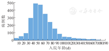 2016年1月1日至2019年12月31日自福棠儿童医学发展研究中心23家儿童专科医院成员单位出院的180 d日龄内首次入院胆道闭锁患儿共2 471例,男1 154例(46.7%,1 154/2 471),女1 317例(53.3%,1 317/2 471)。患儿中位入院年龄为55 d,范围在43~72 d,入院年龄分布见图1。1 417例(57.3%,1 417/2 471)患儿接受了Kasai手术,445例(18.0%,445/2 471)患儿仅做了胆道探查手术,609例(24.6%,609/2 471)未做任何手术。1 417例接受Kasai手术的患儿中,有17例(1.2%,17/1 417)在Kasai术后接受了一次或多次非计划再手术治疗,原因是出现Kasai术后肠道并发症(粘连性肠梗阻、术后小肠套叠)。