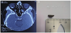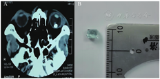 A:术前眼眶CT扫描图像;B:眼球内异物图片