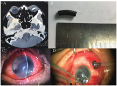 A: Preoperative orbital CT scan. B: Picture of the intraocular foreign body. C: Preoperative slit-lamp photograph. D:Schematic diagram of the intraocular foreign body extraction with intraocular snare.