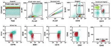 详见图1。分析时应注意患者接受抗CD20单抗治疗后可能导致CD20表达减弱甚至消失。此外,圈定总B细胞的设门抗体不能仅依赖CD19,接受CD19-嵌合抗原受体(CAR)-T细胞治疗后的患者可采用ROR1联合CD24作为替代设门标记[18]。