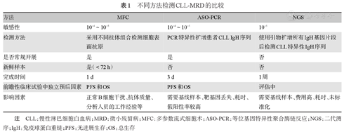 目前用于CLL-MRD的检测方法有多参数流式细胞术(multiparametric flow cytometry, MFC)、二代测序(next generation sequencing, NGS)等[8]。常见方法及比较见表1。