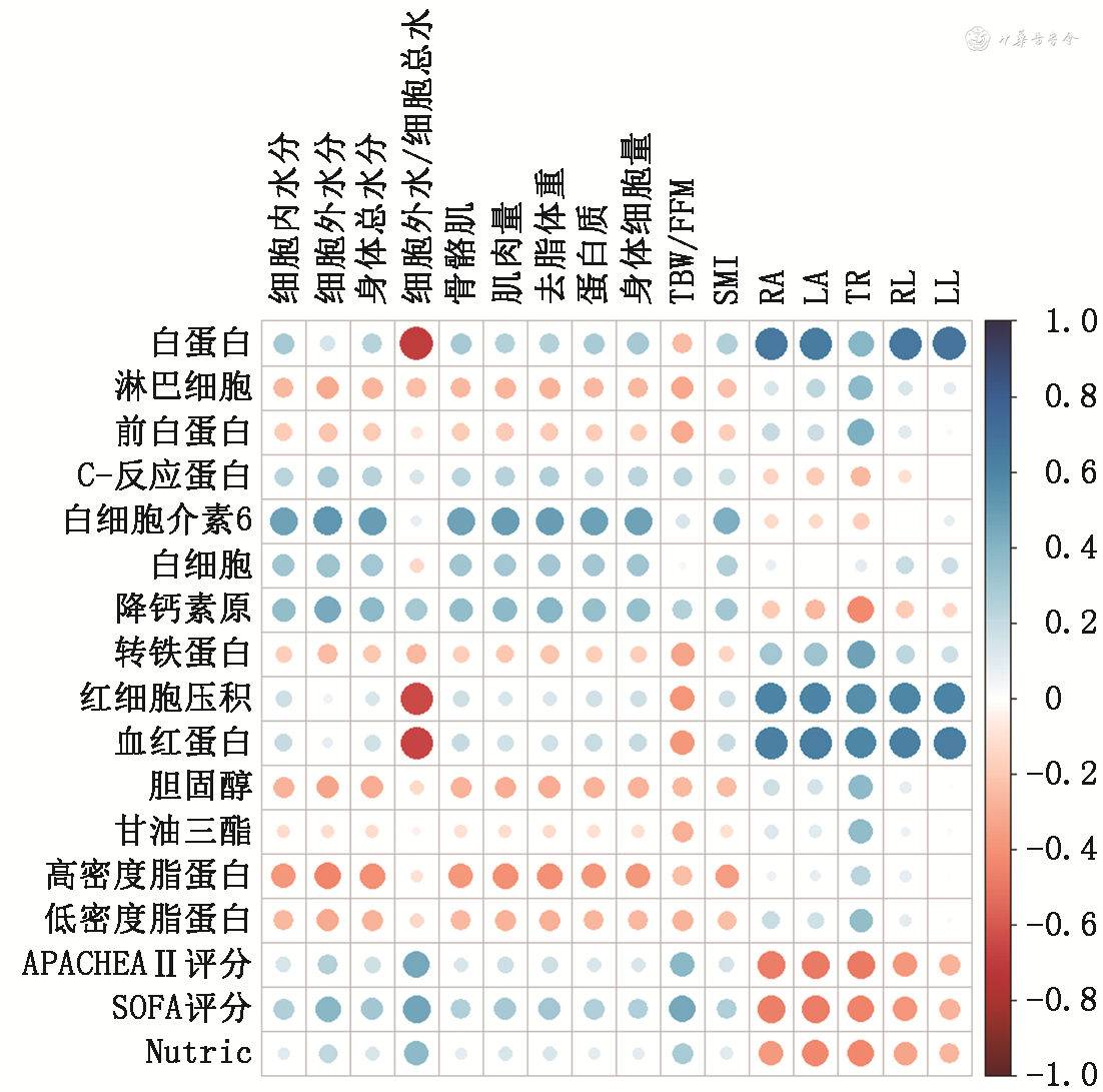 注:APACHEAⅡ评分为急性生理学慢性健康评估Ⅱ评分;SOFA评分为序贯器官衰竭评分;Nutric为重症营养风险评分;TBW/FFM为水合指数;SMI为骨骼肌质量指数;RA为右上肢相位角;LA为左上肢相位角;TR为躯干相位角;RL为右下肢相位角;LL为左下肢相位角