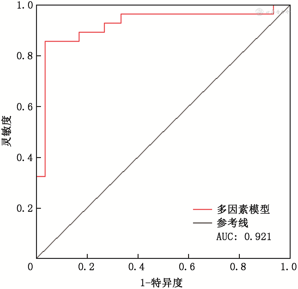 通过逐步回归筛选营养状况的预测因素,再将年龄、性别、白细胞作为混杂因素纳入模型后,得到最终模型为:营养状况=-0.01×年龄+1.22×性别-0.12×白细胞+202.20×ECW/TBW+0.5×躯干相位角-82.16,其中ECW/TBW的OR值为20.8(95%CI:3.7~117.1),P<0.001(表2)。该模型的AUC为0.921(图2)。