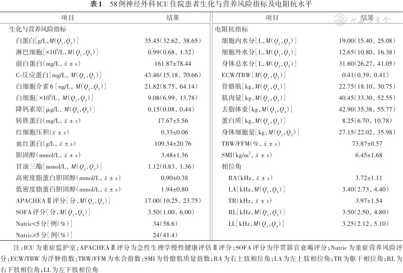 共收集58例神经外科ICU患者,其中男33例,女25例,年龄72.00(59.00,81.75)岁,其中创伤性脑损伤21例,自发性脑出血18例,动脉瘤性蛛网膜下腔出血10例,肿瘤5例,脑脓肿4例。生化指标、营养风险指标及生物电阻抗指标水平见表1。