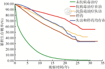 (2)抗病毒治疗对累积生存概率的影响:报告HIV/AIDS全死因死亡密度为4.23/100人年(95%CI:4.19/100人年~4.27/100人年),未抗病毒治疗的病例死亡密度(23.69/100人年)高于抗病毒治疗的病例(1.98/100人年)。是否抗病毒治疗的HIV/AIDS累积生存概率曲线分布差异有统计学意义(χ2=94 041.79,P<0.001),抗病毒治疗能提高HIV/AIDS的生存时间。抗病毒治疗依从性好的病例死亡密度(1.62/100人年)低于抗病毒治疗中失访(2.54/100人年)、停药(3.75/100人年)、抗病毒治疗中失访和停药均存在(2.24/100人年)的病例。是否抗病毒治疗及治疗依从性不同的HIV/AIDS累积生存概率曲线分布差异有统计学意义(χ2=95 056.95,P<0.001),较好的依从性能延长HIV/AIDS的生存时间。见图1,2。