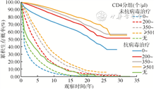 未抗病毒治疗和抗病毒治疗的HIV/AIDS,由于基线CD4计数水平不同,累积生存概率曲线分布差异有统计学意义(χ2=5 462.34,P<0.001;χ2=7 884.22,P<0.001)。没有做CD4检测的HIV/AIDS,即便接受抗病毒治疗,累积生存概率仍然较低,死亡密度较高(24.56/100人年,95%CI:22.57/100人年~26.54/100人年);首次CD4计数0~199个/μl或其他水平的HIV/AIDS,抗病毒治疗之后累积生存概率均有明显提高。见图3。