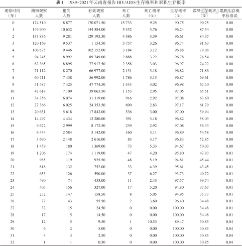 1989-2021年云南省报告HIV/AIDS生存概率和累积生存概率