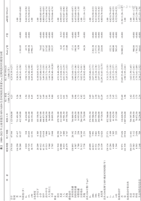 | 因 素 | 观察例数 | 死亡例数 | 观察人年 | 死亡密度 (/100人年) | 死亡率(95%CI) (/100人年) | Wald χ2值 | P值 | aHR值(95%CI) |